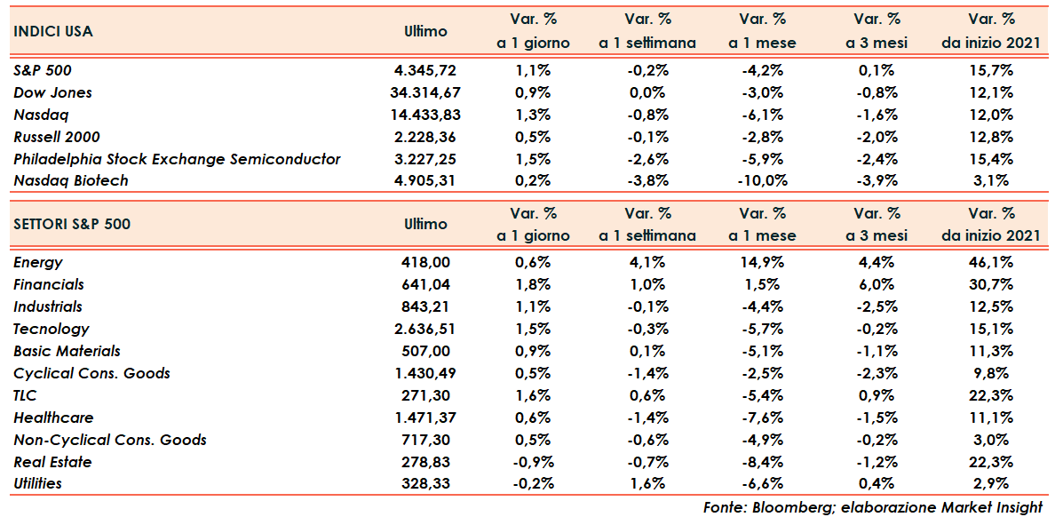 Il Dow Jones avanza dello 0,9%, lo S&P500 dell’1,1%, il Nasdaq del 1,3%, mentre il Russell 2000 guadagna solo mezzo punto.