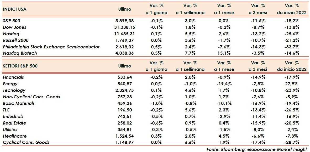Il bilancio settimanale segna il Nasdaq in progresso del 4,5%, lo S&P500 del 1,9% ed il Dow Jones del 0,8%.