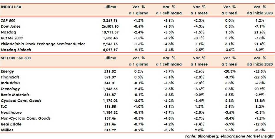 Il bilancio della settimana è stato ben più pesante con lo S&P500 in calo del 5,6%, la peggior discesa da metà marzo. Nel mese, l’arretramento si è limitato, tuttavia, ad un più modesto -2,8%.
