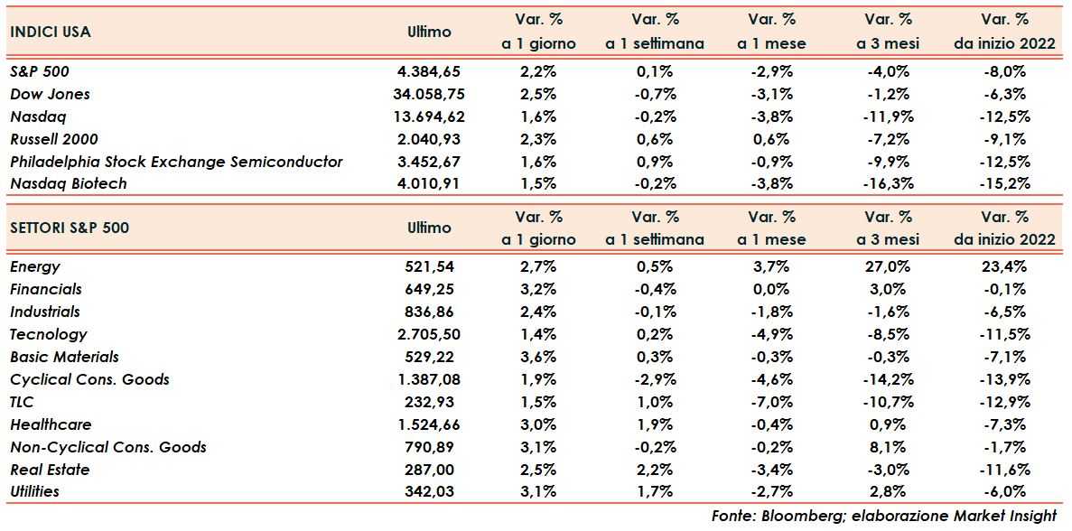 L’indice dei trenta titoli principali ha messo a segno la miglior seduta dal novembre 2020 riuscendo a chiudere l’ottava in verde (+0,1%), grazie al colpo di reni finale. Positivo anche il bilancio della settimana per S&P500 (+0,8%) e Nasdaq (+1,1%).