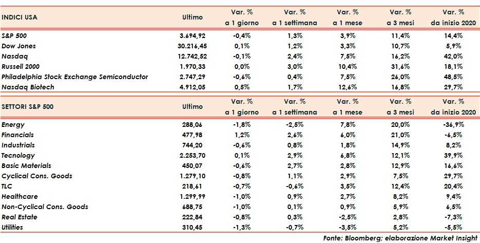 Il bilancio finale vede lo S&P500 in calo dello 0,4%, il Russell 2000 flat, ed il Nasdaq a -0,1% appesantito da Tesla (-6%). Chiude in lieve incremento (+0,1%) solo il Dow Jones.