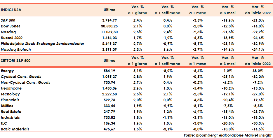 S&P500 e Nasdaq guadagnano il 2,4% e il 2,5%, il Dow Jones il 2,1% ed il Russell 2000 l’1,7%.