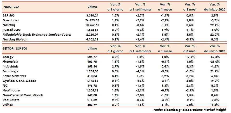 Tutti i quattro principali listini terminano con ampi segni positivi con l’unica incertezza del Nasdaq il quale, nell’ultima ora di contrattazioni, scivola anche in negativo. A pesare sul listino tecnologico (+0,4%) è stata ancora la performance dei titoli a larga capitalizzazione con Amazon ed Apple che cedono poco più di un punto percentuale.