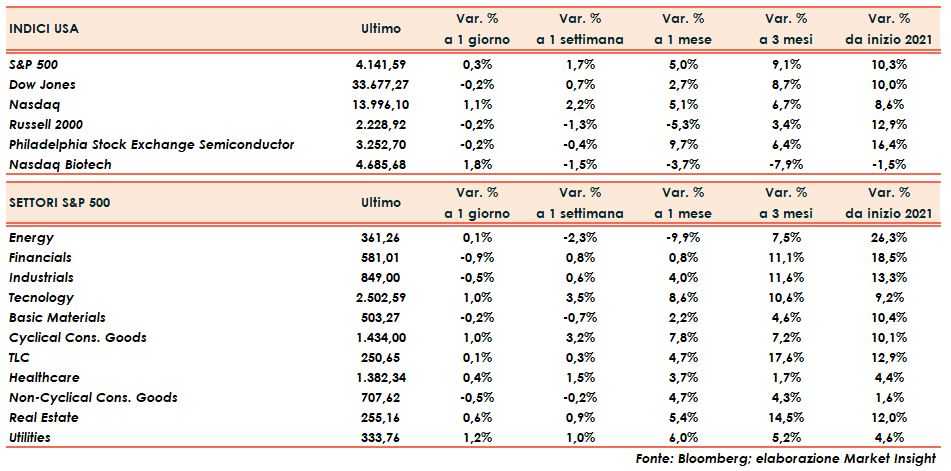 Protagonista assoluto è il Nasdaq che prosegue la sua fase di rimonta (+1%) sfiorando in chiusura la soglia psicologica dei 14.000 punti. Nuovo record dello S&P500 (+0,3%) che beneficia della performance molto brillante di alcuni titoli tecnologici. Nel dettaglio, Tesla mette a segno un altro balzo del sette per cento, Apple del due, mentre Microsoft avanza di un punto percentuale ma quanto basta per realizzare un altro massimo storico, ormai quasi quotidiano.