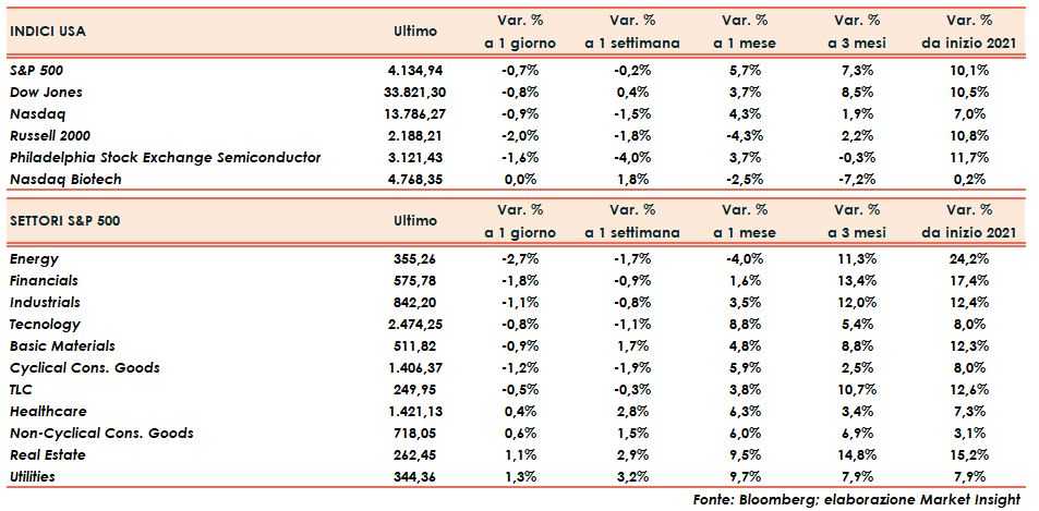 Nasdaq, S&P500 e Dow Jones arretrano rispettivamente dello 0,9%, 0,7% e 0,8% con l’indice dei trenta titoli principali che torna al di sotto di quota 34.000 punti.