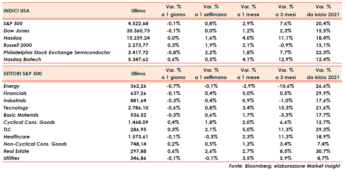 Nel dettaglio arretrano lievemente sia lo S&P500 (-0,1%) che il Dow Jones (-0,1%), mentre il Nasdaq chiude sostanzialmente invariato e il Russell 2000 in lieve rialzo (+0,3%).