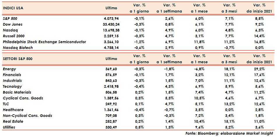Tutti i quattro principali listini non escono dall’anonimato e terminano la seduta in lieve calo: Nasdaq e S&P500 cedono un decimo di punto percentuale, il Russell 2000 due ed il Dow Jones tre.