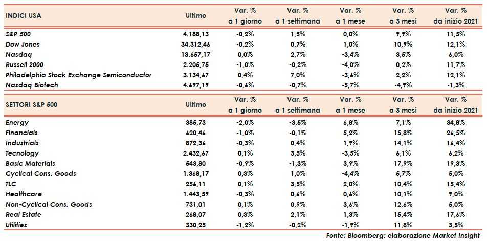 Dow Jones e S&P500 cedono lo 0,2%, mentre il Nasdaq chiude praticamente invariato ed il Russell 2000 cede lo 0,6% dopo una partenza sprint in rialzo di un punto percentuale.