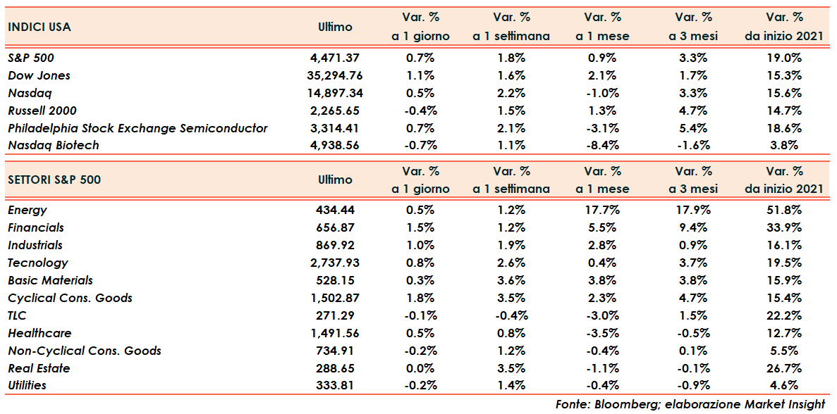 L’ultima seduta della settimana si chiude con il Nasdaq in salita di mezzo punto percentuale, lo S&P500 dello 0,7% ed il Dow Jones del 1,1% con recupero della soglia dei 35.000 punti. In calo marginale solo il Russell 2000 (-0,4%) che comunque aveva sovra perfomato gli altri listini per il resto della settimana.