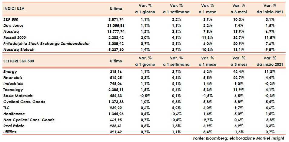 Nasdaq (+1,2%), S&P500 (+1,1%) e Russell 2000 (+1,8%) registrano tutti nuovi massimi storici, con l’indice delle small caps che raggiunge anche la quota dei 2.200, con un progresso del 120% rispetto ai mille punti toccati nel crollo dello scorso marzo.