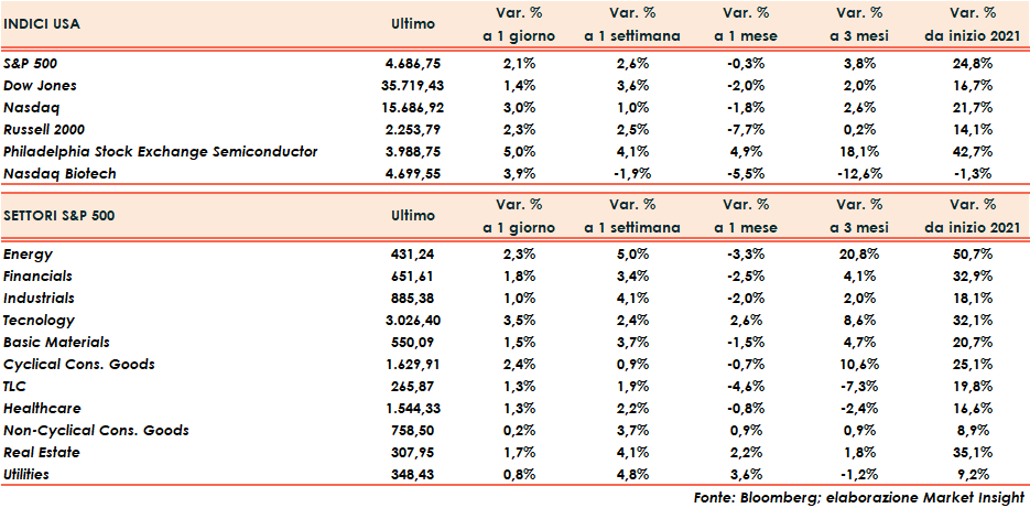 Nello specifico lo S&P500 avanza del 2,1%, il Russell del 1,9% ed il Dow Jones del 1,4%.