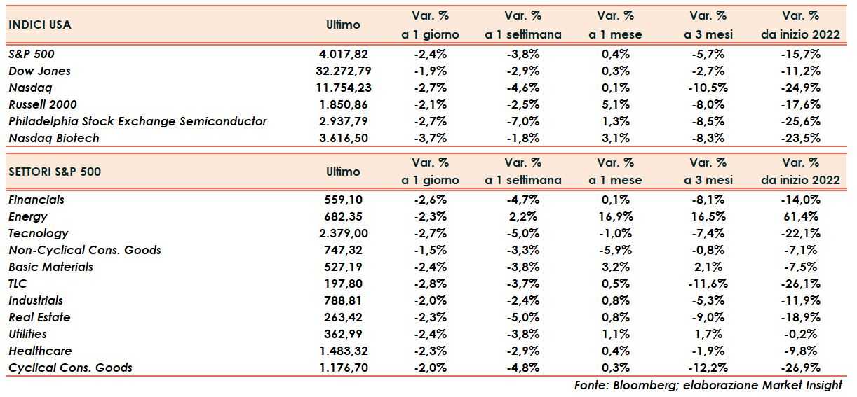 Pesanti anche gli altri indici con lo S&P500 che perde il 2,4%, il Russell 2000 il 2,1% ed il Dow Jones l’1,9%.
