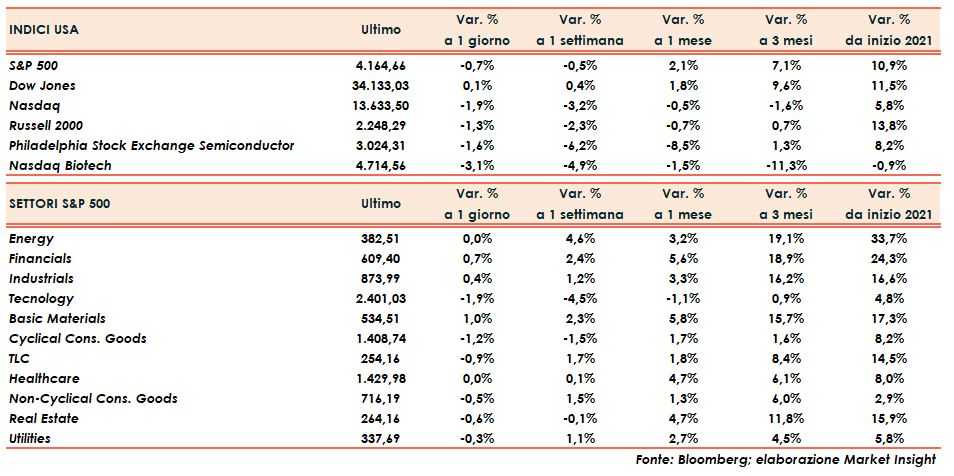 Modesta la perdita dello S&P500 (-0,7%), mentre più in affanno Nasdaq (-1,9%) e Russell 2000 (-2%) con il VIX che avanza di sei punti percentuali a 19,5 dopo aver toccato un massimo a 21,85.