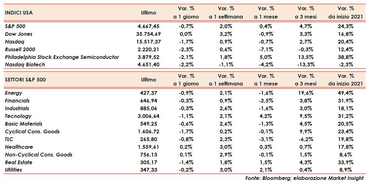 Pesante la caduta del Russell 2000 (-2,3%), mentre lo S&P500 attenua la discesa al -0,7%.