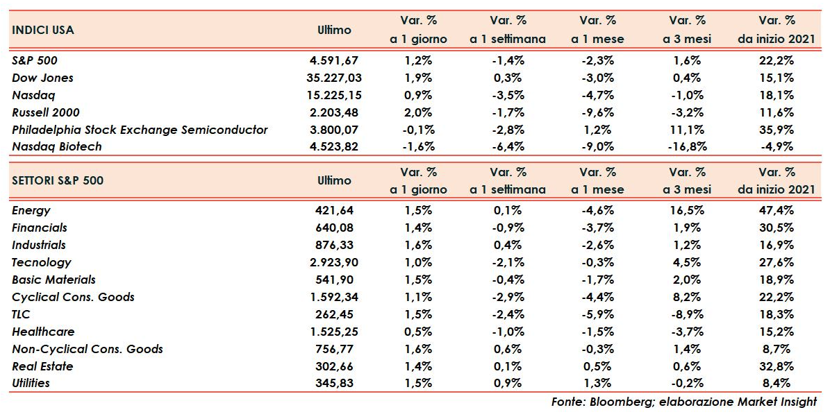 In gran evidenza il Dow Jones che guadagna l’1,9%, oscurato solo dal Russell 2000 (+2%), i due indici che più avevano sofferto nelle ultime sette sedute.