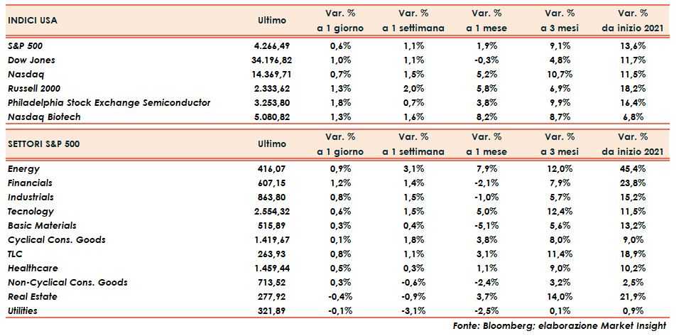 Il bilancio di ieri vede il Dow Jones in crescita di un punto percentuale, lo S&P500 dello 0,6%, il Nasdaq dello 0,7% ed il Russell 2000 dell’1,3%.