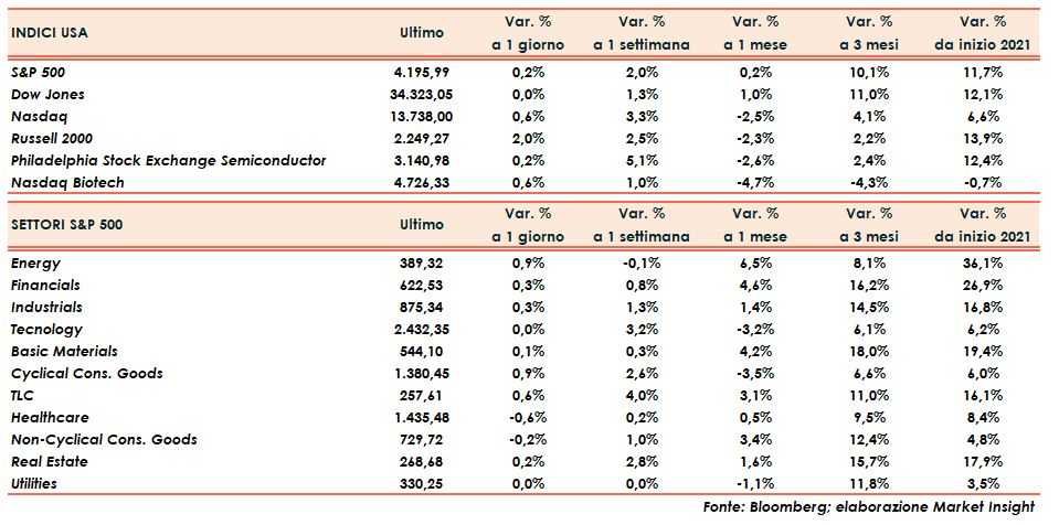 Il mercato, anche in mancanza di temi specifici, rimane sempre molto “bullish” e resta vicino ai massimi storici, almeno per quanto riguarda i due indici principali: il Dow Jones e lo S&P500.