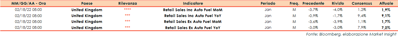 Nel Regno Unito, a gennaio, le vendite al dettaglio escluso il carburante sono aumentate dell’1,7% mensile (consensus +1,1%), rispetto al -3,9% di dicembre (rivisto da -3,6%). Su base tendenziale il dato è aumentato del 7,2%, leggermenteal di sotto delle attese (+7,9%), dopo il -3,8% del mese precedente (rivisto da -3%).