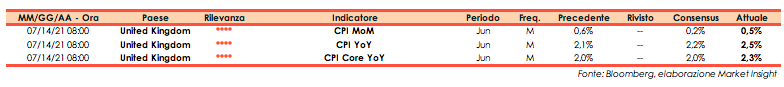 Nel Regno Unito, a giugno i prezzi al consumo sono aumentati (+0,5%) su base mensile, rispetto al +0,2% del consensus e al +0,6% di maggio. Su base annua, sono saliti invece del 2,5%, al di sopra della stima degli analisti (+2,2%), dopo il +2,1% di maggio.