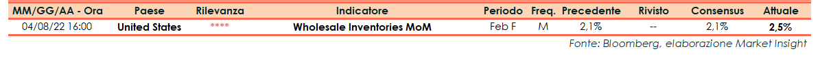 A febbraio il dato finale sulle scorte all’ingrosso statunitensi, diffuso dal Dipartimento del Commercio, ha evidenziato un incremento del 2,5%, superiore al consensus e alla rilevazione preliminare (entrambi +2,1%), dopo il +1,1% di gennaio.