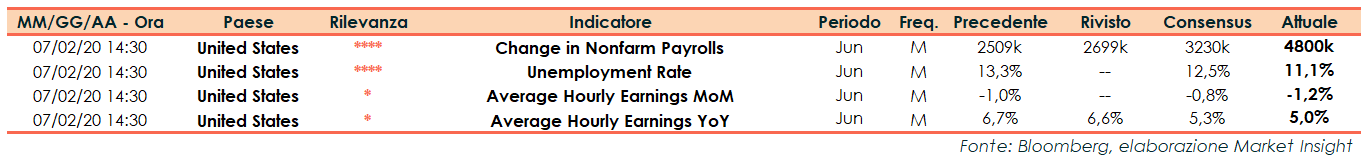 Il dato sugli impieghi ha messo in evidenza un valore positivo nettamente superiore alle aspettative (+3,23 milioni di unità), dopo i 2,699 milioni di nuovi posti di lavoro di maggio (dato rivisto da 2,509 milioni unità inizialmente comunicate). Il tasso di disoccupazione è sceso rispetto al dato del mese precedente (13,3%), battendo positivamente le stime degli analisti (12,5%).