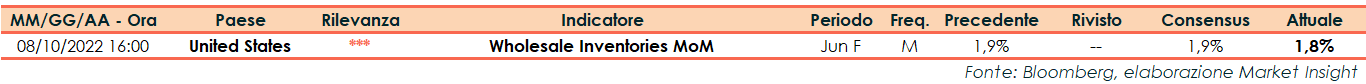A giugno il dato finale diffuso dal Dipartimento del Commercio sulle scorte all’ingrosso statunitensi ha evidenziato un incremento dell’1,8%, leggermente inferiore al consensus e al dato preliminare (entrambi +1,9%).