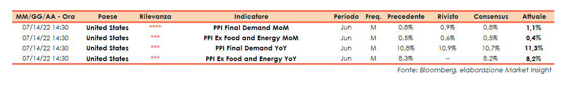 USA – A giugno PPI in aumento a +1,1% m/m (consensus +0,8%) e a +11,3% a/a (consensus +10,7%)