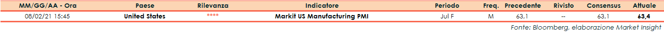 Negli Stati Uniti, a luglio, la lettura finale di Markit Economics ha evidenziato che l’indice Pmi Manifatturiero si è attestato a 63,4 punti, leggermente al di sopra del consensus e del dato preliminare, entrambi a 63,1 punti.