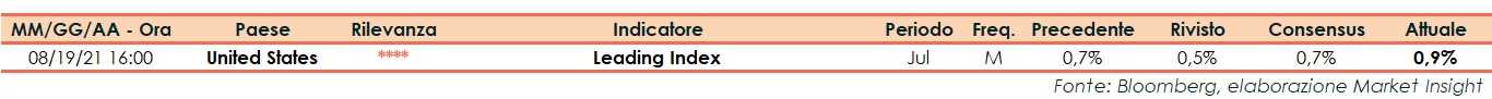 A luglio il Leading Index del Conference Board statunitense è aumentato dello 0,9%, dopo il +0,5% di giugno (rivisto da +0,7%). Il consensus si attendeva una variazione positiva dello 0,7%.