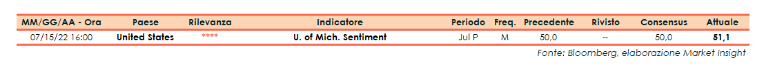Gli esperti dell’Università del Michigan hanno reso noto il dato finale dell’indice sulla fiducia dei consumatori per il mese di luglio, attestatosi a 51,1 punti. L’indicatore si è rivelato superiore al consensus e al dato preliminare (entrambi 50 punti).