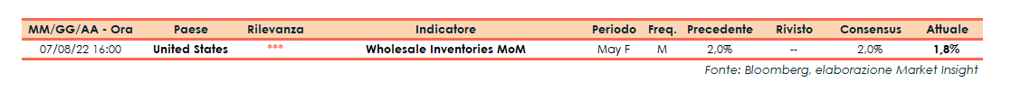 A maggio il dato finale diffuso dal Dipartimento del Commercio sulle scorte all’ingrosso statunitensi ha evidenziato un incremento dell’1,8%, leggermente inferiore al consensus e al dato preliminare (entrambi +2%).