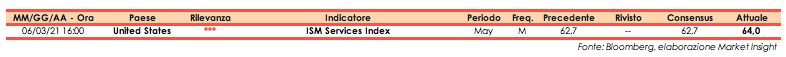 A maggio l’indice ISM servizi degli Stati Uniti ha registrato un valore di 64 punti, al di sopra del consensus degli analisti e della rilevazione di aprile (entrambe pari a 62,7 punti).