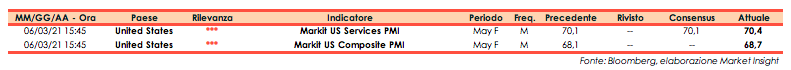 Markit ha reso noto che nel mese di maggio l’Indice finale Pmi Servizi degli Stati Uniti si è attestato a 70,4 punti, al di sopra del dato preliminare e del consensus (70,1 punti). Ricordiamo che ad aprile l’indice evidenziava un valore pari a 64,7 punti.