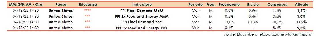 Il Dipartimento del Lavoro degli Stati Uniti ha reso noto che nel mese di marzo l’indice grezzo dei prezzi alla produzione (PPI) ha evidenziato un incremento dell’1,4% su base mensile, superiore alle attese (+1,1%) e al +0,9% di febbraio (rivisto da +0,8%). Su base annua, i PPI sono aumentati del 11,2%, anch’essi superiori al consensus (+10,6%) e alla lettura del mese precedente (+10,3% rivista da +10%).