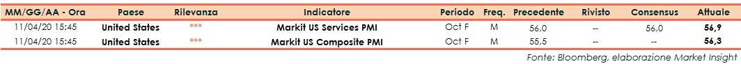 A ottobre la lettura finale dell’indice Markit Pmi Servizi degli Stati Uniti si è attestata a 56,9 punti, al di sopra delle attese degli analisti e della rilevazione preliminare (entrambi 56 punti). Il dato si è rivelato superiore anche ai 54,6 punti di settembre.