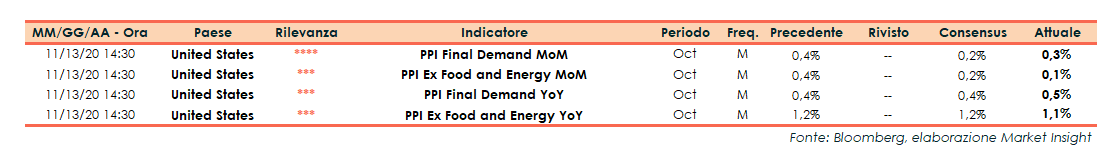 Il Dipartimento del Lavoro degli Stati Uniti ha reso noto che nel mese di ottobre l’indice grezzo dei prezzi alla produzione (PPI) ha evidenziato un incremento dello 0,3% su base mensile, dopo il +0,4% di settembre. Gli analisti si aspettavano un incremento dello 0,2 per cento. Su base annua, il PPI è aumentato dello 0,5%, dopo il +0,4% di settembre (consensus +0,4%).