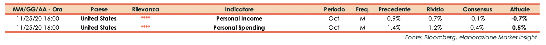 A ottobre il reddito personale negli Usa evidenzia un calo dello 0,7% (-0,1% consensus) dopo il +0,7% di settembre (rivisto da +0,9%).