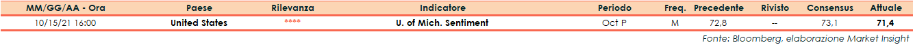 Gli esperti dell’Università del Michigan hanno reso noto il dato preliminare dell’indice sulla fiducia dei consumatori per il mese di ottobre, attestatosi a 71,4 punti. L’indicatore si è rivelato inferiore al consensus (73,1 punti) e al dato finale di settembre, pari a 72,8 punti.