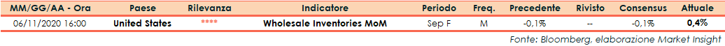 A settembre il dato finale diffuso dal Dipartimento del Commercio sulle scorte all’ingrosso statunitensi ha evidenziato un incremento dello 0,4%, contro un consensus che indicava una flessione dello 0,1% (come la lettura preliminare). Il dato finale di agosto evidenziava un incremento del +0,4%.