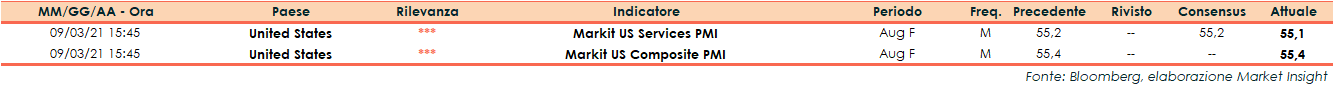 Negli Stati Uniti, ad agosto, la lettura finale di Markit Economics ha evidenziato che l’indice sui servizi si è attestato a 55,1 punti, sostanzialmente in linea con il consensus e con la rilevazione preliminare (entrambi a 55,2 punti).