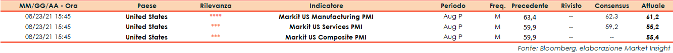 Negli Stati Uniti, ad agosto, la lettura preliminare di Markit Economics ha evidenziato che l’indice Pmi Manifatturiero si è attestato a 61,2 punti, al di sotto del consensus (62,3 punti). Il dato finale di luglio evidenziava un valore di 63,4 punti.