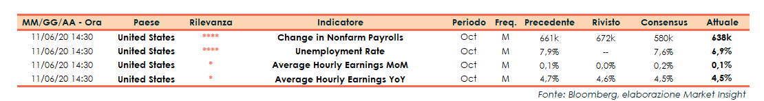 Infine, sempre a ottobre, la variazione del salario medio orario su base mensile è stata pari a +0,1% (consensus +0,2%) dopo il +0,0% di settembre (rivisto da +0,1%). Su base annua il salario medio orario è aumentato del 4,5%, coerentemente con le stime, dopo il +4,6% del mese precedente (rivisto da +4,7%).
