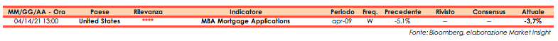 Nella settimana terminata il 9 aprile l’indice Mba, che misura le nuove richieste di ipoteche negli Stati Uniti, ha registrato un calo del 3,7% dopo il -5,1% della precedente settimana.