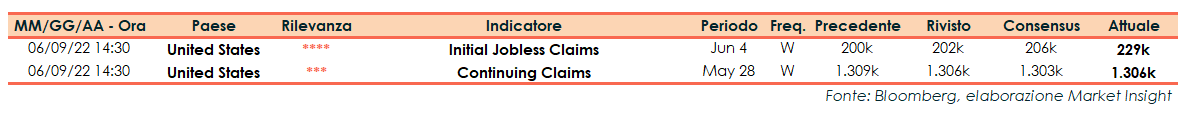 Nella settimana che si è conclusa il 4 giugno le richieste di sussidi di disoccupazione negli Stati Uniti sono risultate pari a 229mila unità, al di sopra delle 206mila unità previste dal consensus e delle 202mila unità della settimana precedente (dato rivisto da 200mila unità).