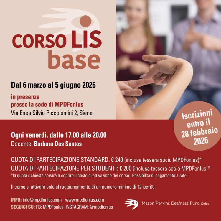 Il corso di 36 ore tra marzo e giugno è organizzato da MPDFonlus e tenuto dalla docente sorda Barbara Dos Santos – iscrizioni entro il 28 febbraio 2026