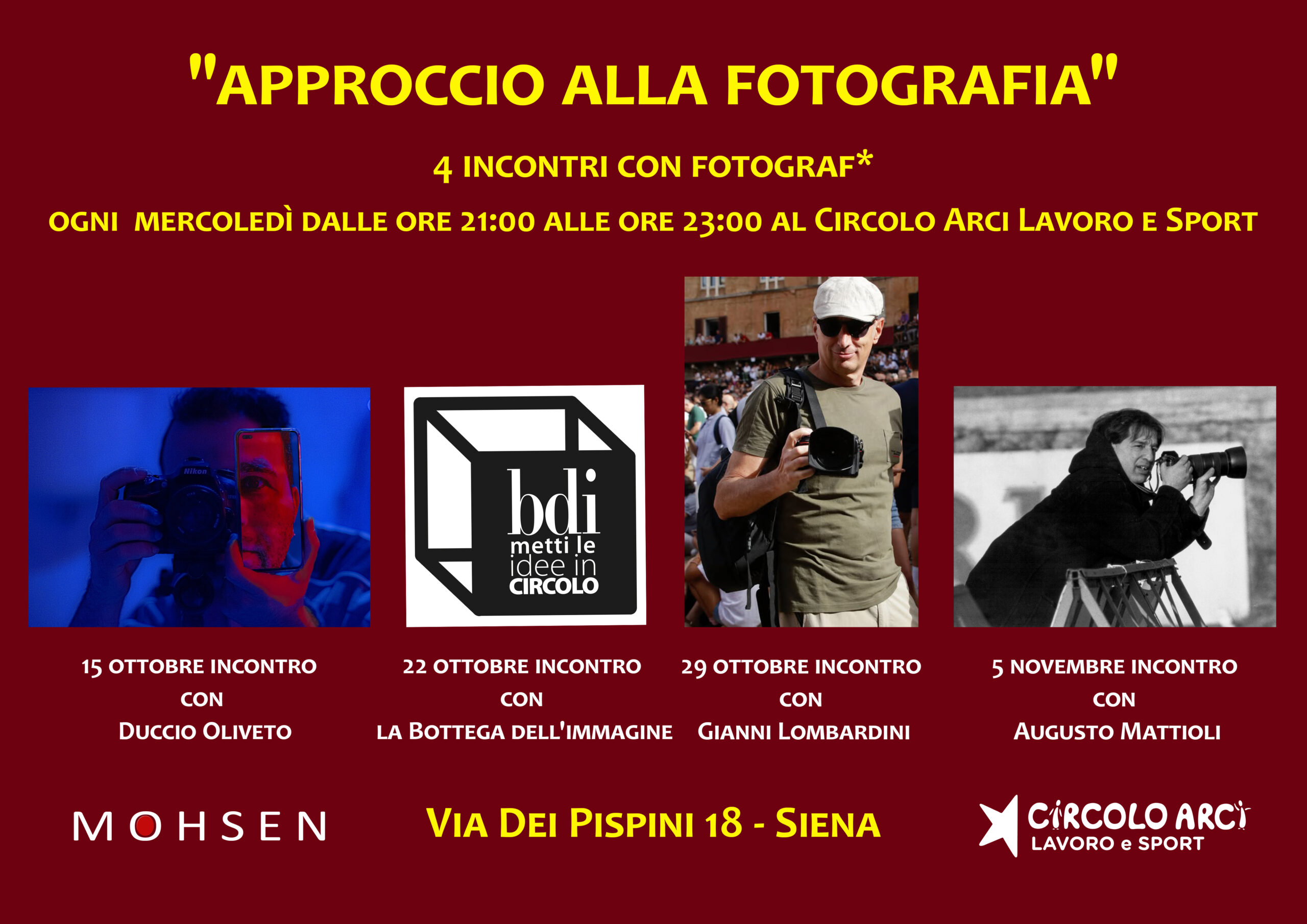 SIENA. Il corso di fotografia alla galleria Mohsen e al Circolo Arci Lavoro e Sport approfondisce tematiche relative sia alla tecnica che al linguaggio fotografico. Alla fine di ogni corso, vengono organizzati 3/4 incontri con fotografi, che raccontano il loro personale approccio alla fotografia.
