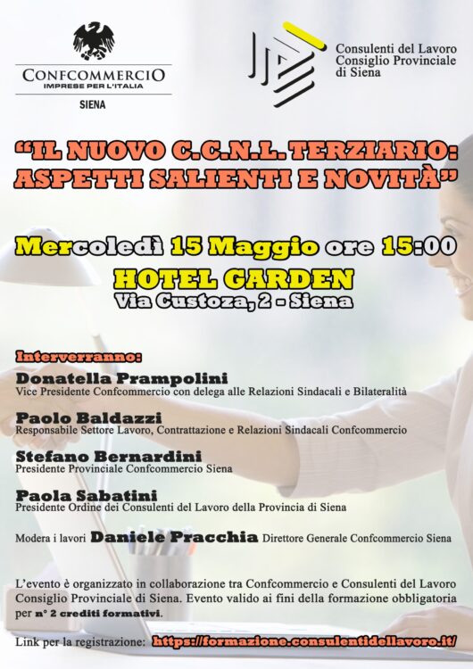 Primo appuntamento, dunque, il 15 maggio con “Il nuovo Ccnl terziario, aspetti, salienti e novità”. Interverranno Donatella Prampolini, vice presidente Confcommercio con delega alle Relazioni Sindacali e Bilateralità, Paolo Baldazzi, responsabile settore Lavoro, Contrattazione e Relazioni Sindacali Confcommercio, Stefano Bernardini, presidente provinciale Confcommercio Siena, Paola Sabatini, presidente Ordine dei Consulenti del Lavoro Provincia di Siena. Modererà Daniele Pracchia, direttore generale Confcommercio Siena. L’evento è organizzato in collaborazione tra Confcommercio e Consulenti del lavoro Consiglio Provinciale di Siena ed è valido ai fine della formazione obbligatoria per 2 crediti formativi. E’ possibile iscriversi qui https://rb.gy/vz9u9o