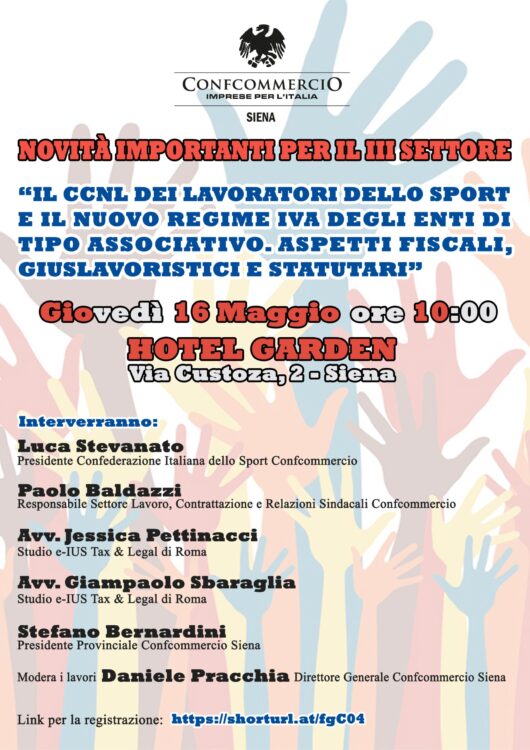 Tante novità ci sono anche per il terzo settore. Così Confcommercio ha deciso di illustrare il “Contratto di lavoro nazionale dei lavoratori dello sport e il nuovo regime iva degli enti di tipo associativo. Aspetti fiscali, giuslavoristici e statutari“. Questo è l’argomento di cui si parlerà giovedì 16 maggio. Interverranno Luca Stevanato, presidente Confederazione Italiana dello Sport Confcommercio, Paolo Baldazzi, responsabile Settore Lavoro, Contrattazione e Relazione Sindacali Confcommercio. L’avvocato Jessica Pettinacci, Studio e-IUS Tax & Legal di Roma, Avvocato Giampaolo Sbaraglia, Studio e-IUS Tax & Legal di Roma. E’ possibile iscriversi qui https://shorturl.at/fgC04.