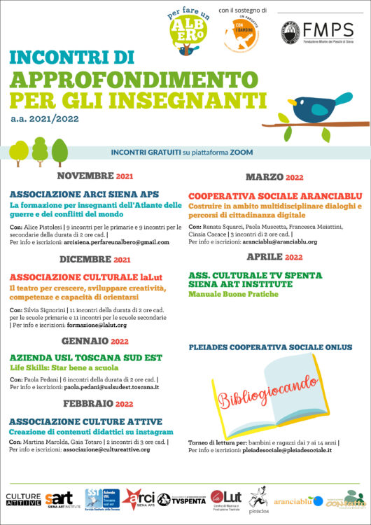 “Per fare un albero…” insieme ai suoi partner propone una serie di incontri di approfondimento online, rivolti agli insegnanti delle primarie e secondarie di primo grado, riferite agli Istituti Comprensivi di tutta la provincia: Valdelsa, Siena, Valdichiana, Valdorcia.