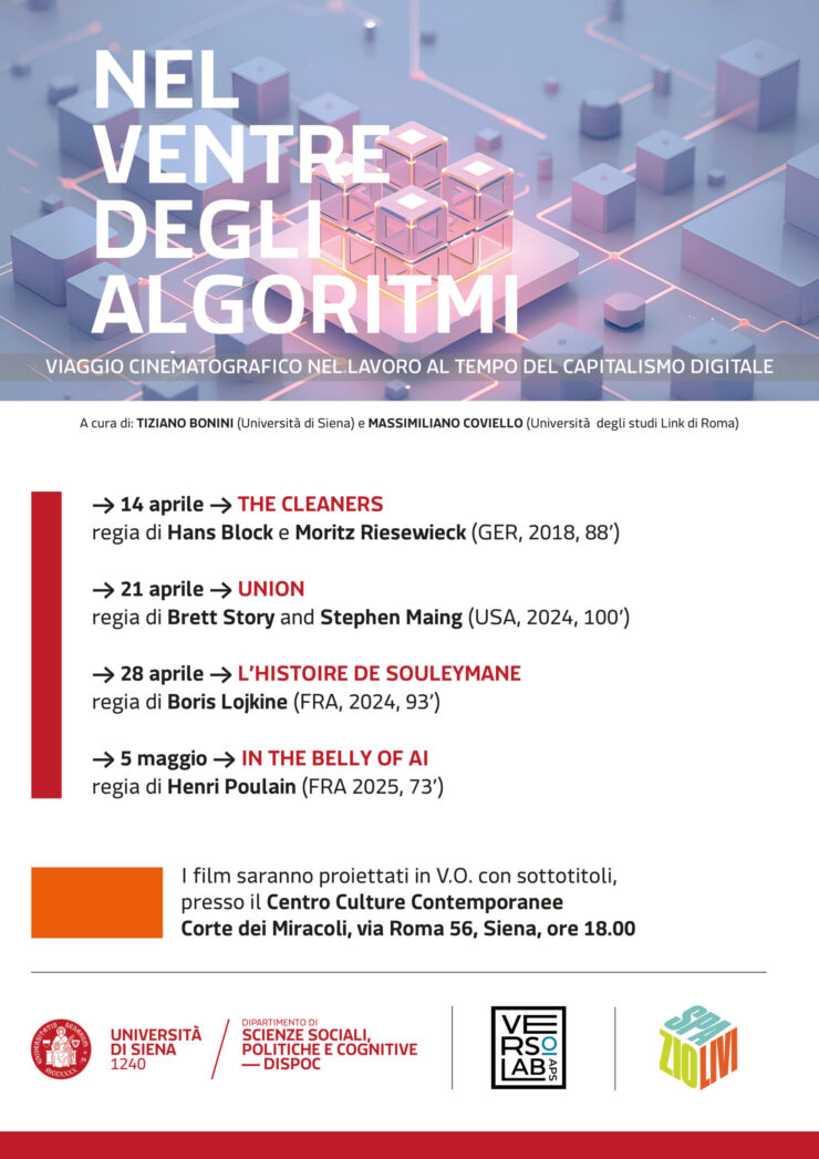 SIENA. Prende il via il 14 aprile 2026 “Nel ventre degli algoritmi. Viaggio cinematografico nel lavoro al tempo del capitalismo digitale”, un ciclo di proiezioni che esplora come il lavoro contemporaneo venga trasformato dalle piattaforme digitali, dall’automazione e dall’intelligenza artificiale.